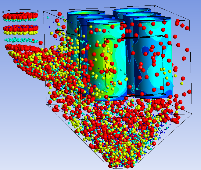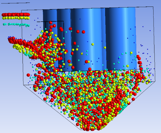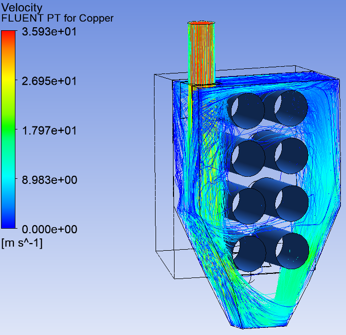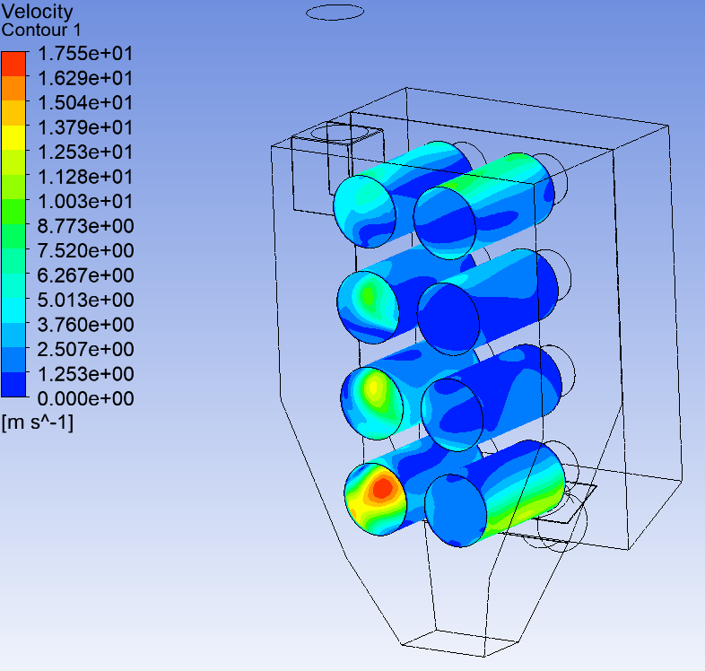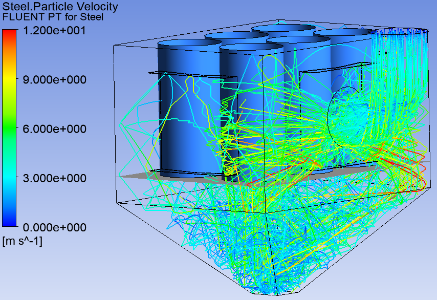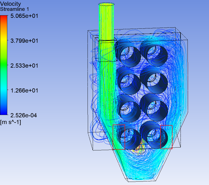 針對>100um粒徑的顆粒,對其進行顆粒軌跡分析,由圖2.4可知,大顆粒1號和3號濾筒附近的表面顆粒速度在6~9m/s,對濾筒沖擊較大,線條密集代表此處的顆粒較多,從圖2.5顆粒分布圖模擬圖也佐證了這一點。