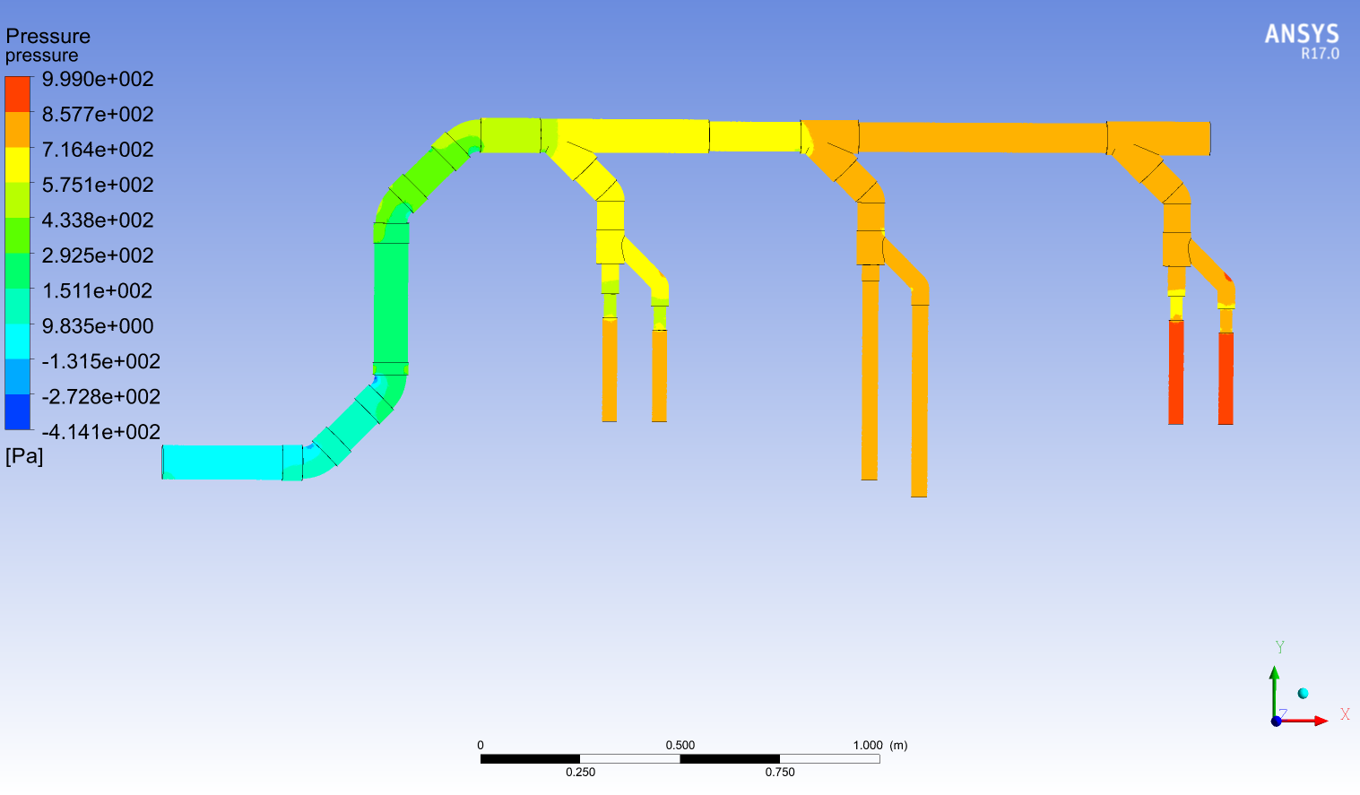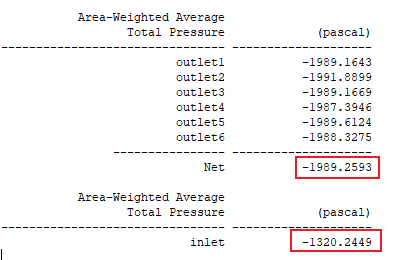 這里使用進出口平均壓強差來定性判斷改進前后系統能耗變化情況。改進前進出口壓降如圖3.2所示,進口平均壓強為-1017.7199Pa,出口平均壓強為-1988.2845Pa,系統壓降為970.5646Pa