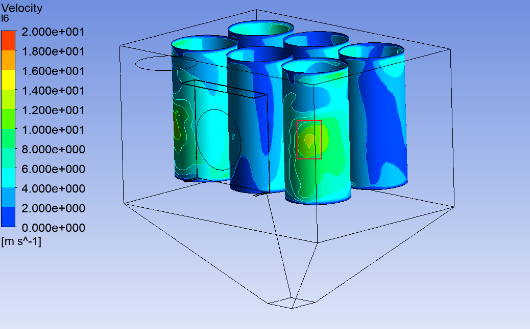實際工作情況中,主要是1號和3號濾筒受損嚴重。由于整個系統為對稱結構,因此兩個濾筒表面情況類似,這里僅針對1號濾筒進行分析。濾筒表面風速云圖如圖2.3所示,1號濾筒三個方框的位置表面風速較高,最高接近20m/s,接近入口風速,因此這三個地方的受損比較嚴重,實際情況也確實如此。因此需要降低濾筒表面風速,即間接降低小粒徑顆粒對濾筒的沖刷速度。濾筒的表面最大風速如下表所示。